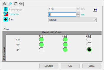 Definieren Sie die Scanpfad-Eigenschaften über einen beliebigen Scan dialog (linear, Freiform usw.). Im selben Dialog können auch die Einstellungen für Laserbreite und -dichte festgelegt werden. Nähere Angaben hierzu finden Sie im Thema "Scan-Zoom-Modi (für HP-L-Sensoren)".