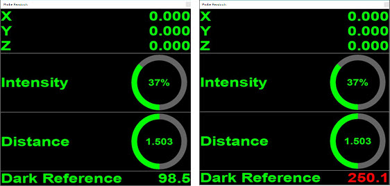 Das Taster-Anzeigefenster zeigt den Dunkle Bezug innerhalb der Grenzwerte (links) und die Grenzwertüberschreitung (rechts) an.
