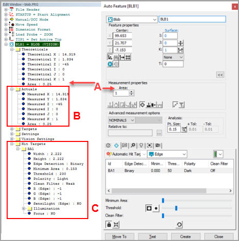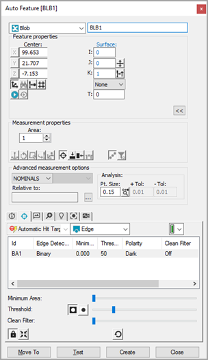 Wenn Sie die Nenn- oder Messwerte für ein Sprenkelelement zurückgeben möchten, können Sie die Erweiterungen .AREA oder .TAREA mit der Sprenkel-ID verwenden. Diese Referenzausdrücke geben die gemessene Fläche bzw. die theoretische Fläche für das Auto-Element Sprenkel (Blob) zurück. Weitere Informationen finden Sie unter "Verweise vom Typ "Double"" im Kapitel "Arbeiten mit Ausdrücken" der Hauptdokumentation von PC-DMIS.