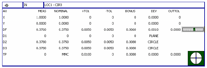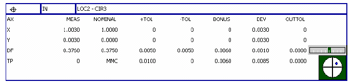 Results: A "Virtual Hard Gage" simulation is performed mathematically by translating and rotating based on the amount of bonus tolerance from the datum(s). This results in the measured values for the feature changing by the amount of "datum shift" which simulates the jiggling of the gage. In many cases, the measured values may be the same as the nominal values when there is sufficient bonus from the datum features. When the feature is out of tolerance, no fitting occurs, and the measured values and deviations reflect the actual location of the feature such that process adjustments can be made or an engineering analysis of the nonconformance can be performed.