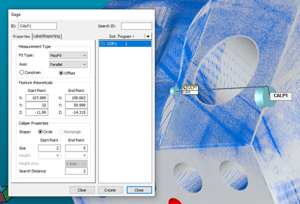 Söksträcka: Standardvärdet är 2 mm. Detta värde definierar längden, från den nominella punkten, på vardera sidan om den mätta punkten. Söksträckan längs med skjutmåttets mätspetsform skapar en cylindrisk zon. Alla data inom denna zon utvärderas för att bestämma skjutmåttets höga punkt.