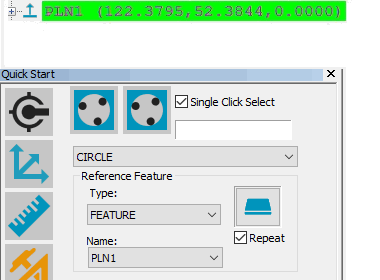 完成平面后,快速启动对话框会返回到“测量的圆”模式。便携式 PC-DMIS 会自动将“测量的平面”添加到参考特征名称列表中,并在“编辑”窗口中突出显示。