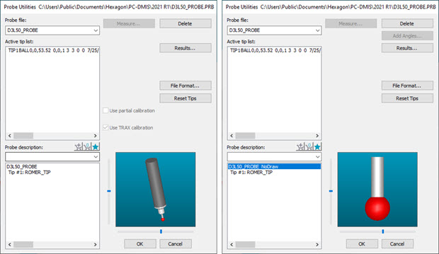 如果您之前使用2021.1之前的PC-DMIS版本并更新到2021.1或更高版本,则需要在完成更新后立即删除原始的Romer RDS接触式测头 (.PRB) 文件。删除接触式测头文件并启动PC-DMIS后,当您连接到便携式测量臂时,软件会自动重新创建接触式测头文件。然后,您可以在测头工具对话框中查看各个组件。