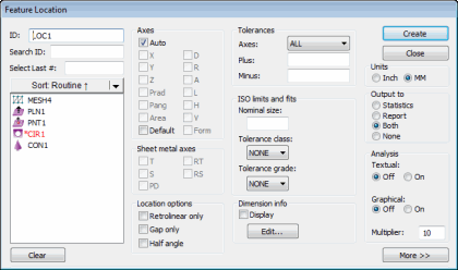 Mit der Menüoption Einfügen | Merkmal | Lage können Sie den Abstand des Elements zu den X-, Y- und Z-Nullpunkten, parallel zur jeweiligen Achse berechnen. Durchmesser, Winkel und Vektor des Elements werden ebenfalls in der Berechnung berücksichtigt. Dieser Abschnitt bezieht sich nur auf die Lage- bzw. Koordinatenerstellung des Merkmals. Informationen zu Positionsmerkmalen finden Sie unter "Merkmal 'Position' erstellen".