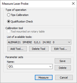 Mit den Optionen, die im Dialogfeld Lasertaster kalibrieren verfügbar sind, wird das Verfahren bestimmt, das zur Lasersensorkalibrierung ausgeführt wird. Öffnen Sie das Dialogfeld Taster-Hilfsprogramme (Einfügen | Hardwaredefinition | Taster) und klicken Sie anschließend auf Messen.