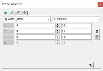 Über die Menüoption Ansicht | Weitere Fenster | Taster -Werkzeugleiste wird die Taster-Werkzeugleiste eingeblendet. Die Taster-Werkzeugleiste enthält verschiedene Lasersensor-Parameter, die zur Erfassung von Datenpunkten verwendet werden, die von einer Messroutine benötigt werden.