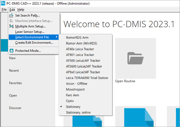 Mit der Einführung des Umgebungskonfigurators in PC-DMIS Version 2023.1 hat sich die Art und Weise, wie Sie diese Auswahl treffen, geändert. Ab dieser Version verwenden Sie jetzt die Menüoption Bearbeiten | Umgebungsdatei auswählen. Wenn Sie auf diese Menüoption klicken, zeigt PC-DMIS eine Liste von Elementen an, die auf Ihrer Lizenz basieren.