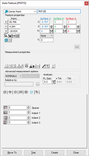 Das Dialogfeld Auto-Element für Eckpunkt zeigt zum Beispiel die drei Einrückungsoptionen auf der Registerkarte Stützpunkte-Eigenschaften taktil der Taster-Werkzeugleiste.