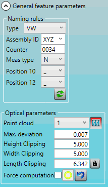 Pointcloud list: Select the pointcloud from which you want to extract the feature. Max. deviation box: Type the maximum deviation between two points in the COP. If two points have a higher deviation, the extraction fails. Height Clipping box: Type the value to define the height of the yellow clipping box. Width Clipping box: Type the value to define the width of the yellow clipping box. Length Clipping box: Type the value to define the length of the yellow clipping box. Force computation check box: If you select this check box, ESF tries to extract the feature even if you do not complete the other parameters in this area. |