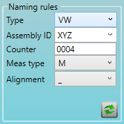 These options replace the Alignment list when you select N from the Meas type list: Position 10 list: Select the vehicle coordinate system for the VW naming rule. Position 12 list: Select the alignment area for the VW naming rule. Select the alignment area for the VW naming rule: These options appear when you select the Custom type: