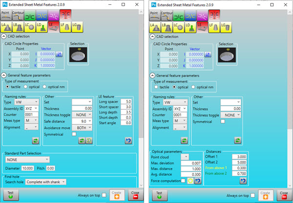 You can see that, for the optical option on the right, the LE feature area of the tactile option on the left disappears, and is replaced by the Optical parameters and Distances areas.