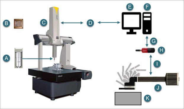 You can measure roughness on a Global S Chrome CMM with an LSPX 5 HD probe head, FDC 800 controller, and PROFILER R sensor. The following diagram shows how a CMM with a PROFILER R sensor measures roughness: