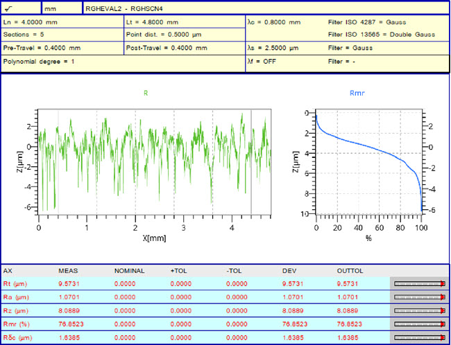 ISO 4287 with Rmr - This option generates a PDF report with plots drawn according to the ISO 4287 standard and material ratio plot (Rmr).
