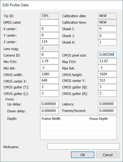 Once you have created a vision tip, select Edit from the Probe Utilities dialog box to edit the probe data for the selected tip. Default values are provided according to the defined probe. This opens the Edit Probe Data dialog box.