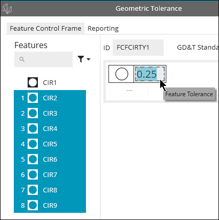 Dans l'éditeur de cadres de contrôle d'éléments, dans le FCF, cliquez sur la section Tolérance d'élément et définissez une tolérance de 0,25.