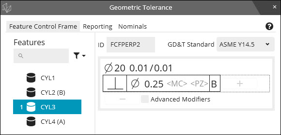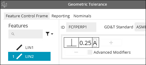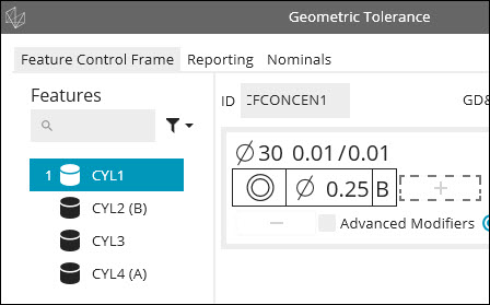 Dans l'éditeur de cadres de contrôle d'éléments (FCF), dans la boîte de dialogue, cliquez sur la section Tolérance d'élément et définissez une tolérance de 0,25.