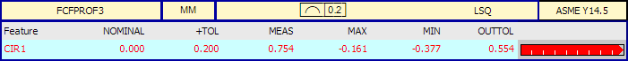 Ci-après un exemple de rapport pour une tolérance de profil d'une droite par unité : L'étiquette supérieure est pour le profil global, celle inférieure pour le profil par unité.