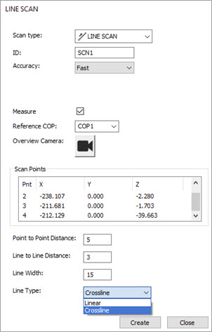 Cliquez sur Créer pour ajouter la commande de scanning linéaire dans la fenêtre de modification, puis sur Fermer pour revenir à l'écran principal de PC-DMIS.