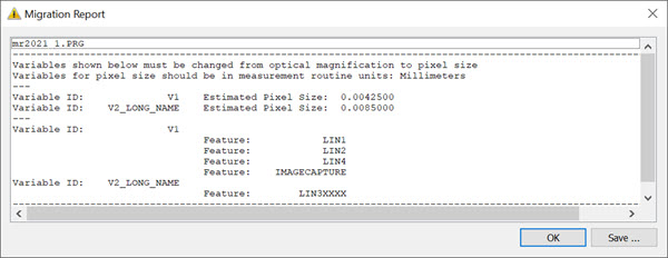 Quand vous enregistrez une routine de mesure dans une version antérieure à PC-DMIS version 2022.1, PC-DMIS l'analyse pour rechercher toutes les instances des variables de taille de pixel. S'il en trouve, il affiche un message semblable à ceci :