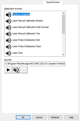 Ses Olayları sekmesi (Düzen | Tercihler | Ayar) seçtiğiniz bir ses dosyalı ile ilişkilendirebileceğiniz uygulama olaylarının bir listesini içerir. Olay meydana geldiğinde, PC-DMIS ilişkili sesi otomatik olarak çalar.