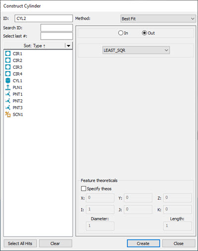 PC-DMIS bir silindir oluştururken bir kaç yönteme izin vermektedir. Aşağıdaki tabloda gerekli girişlerinin yanı sıra çeşitli oluşturulmuş silindir türleri listelenmektedir. Bazı özellikler altı veya daha fazla giriş gerektirirken bazıları hiç giriş gerektirmez. Aşağıdaki tabloda, "Herhangi biri" terimi oluşturma işleminde oluşturma için herhangi bir özellik türünün kullanılabileceğini belirtir. PC-DMIS özellikleri herhangi bir sırada seçmenize izin verir.