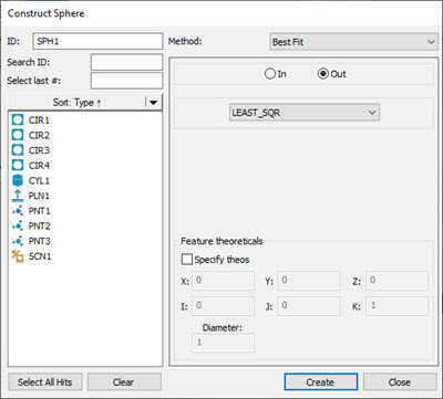 PC-DMIS ile küre oluşturmak için birkaç yöntem vardır. Aşağıdaki tabloda gerekli girişler ile birlikte, oluşturulmuş çeşitli küre türleri listelenmektedir. Bazı özellikler beş veya daha fazla giriş gerektirirken bazıları hiç giriş gerektirmez. Aşağıdaki tabloda bulunan "Herhangi biri" terimi, oluşturma işleminde oluşturma için herhangi bir özellik türünün kullanılabileceğini belirtir. PC-DMIS özelliklerin herhangi bir sırada seçilmesine izin verir.