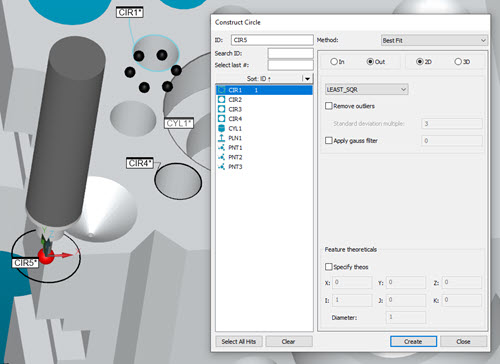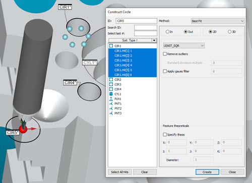Bu özellik için En Uygun veya EU Telafi (En Uygun Telafi) yöntemini seçerseniz, PC-DMIS, kitle merkezleri yerine giriş özelliklerinin tek tek vuruşlarından yapı oluşturmak için Tüm Vuruşları Seç düğmesini tıklatmanıza olanak tanır.