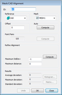 在最大标准偏差框中,为网格中的点与 CAD 模型之间的自动坐标系执行定义最大标准偏差。执行自动坐标系命令时,如果网格/CAD 偏差的标准偏差大于定义的最大值,则可选择点对,获得更好的坐标系。默认值为 -1,相当于无限允许的标准偏差。